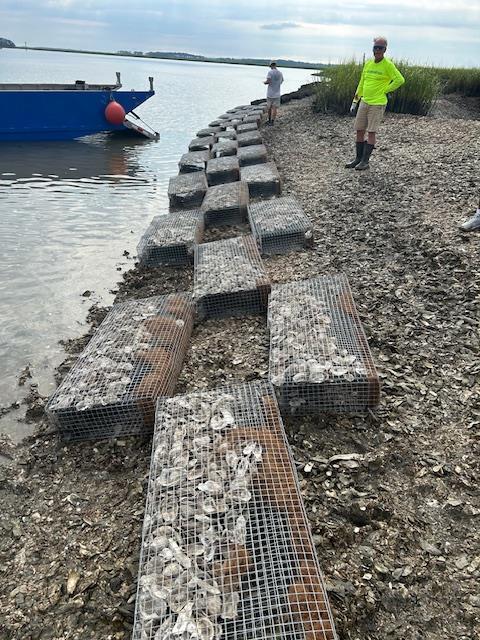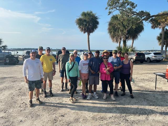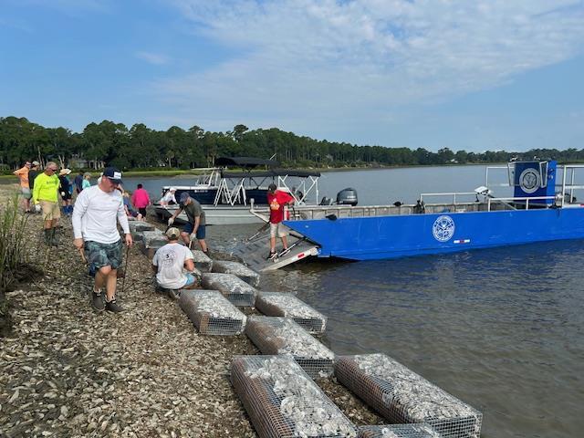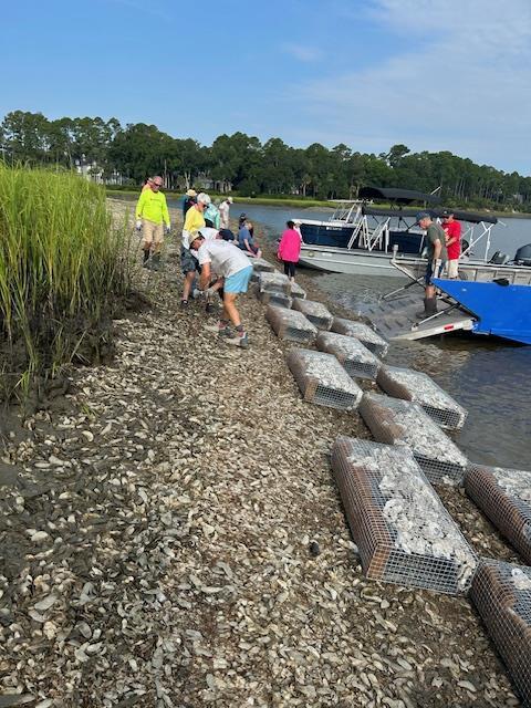 On August 16 17 Rotarians and friends placed Manufactured Wire Reefs (MWRs) along the shore of the May River. This volunteer project is done in concert with the South Carolina Department of Natural Resources, as part of their South Carolina Oyster Restoration and Enhancement Program (SCORE). The MWRs we placed along the shoreline were ones that our club volunteers built last October. We will have another SCORE project in the near future in order to build more of the MWRs for future placement along the banks of the May River.
